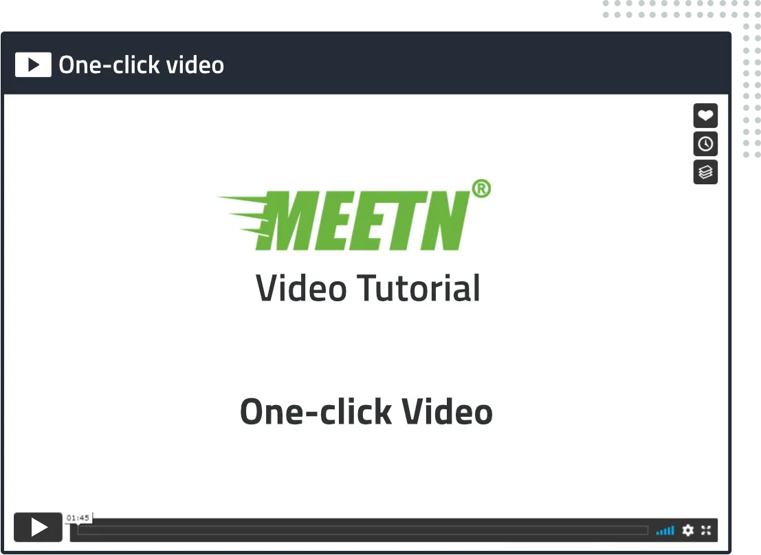 Graba tus webinars, reuniones y eventos en HD. Con Meetn®, tus enlaces de evento se convierten automáticamente en enlaces de repetición (si así lo eliges), para que tu audiencia siempre tenga acceso con un clic a tu contenido, lo comparta y maximice tu alcance y exposición.